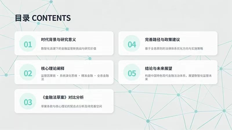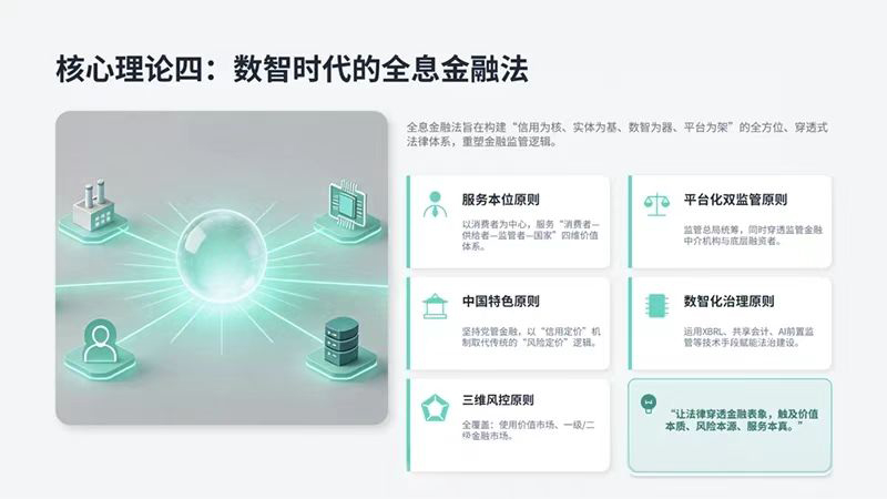 4.全息金融法理论:旨在构建 “信用为核、实体为基、数智为器、平台为架” 的法律体系,通过五大原则(服务本位、中国特色、三维风控、平台化双监管、数智化治理)实现对金融活动的全方位、穿透式治理。