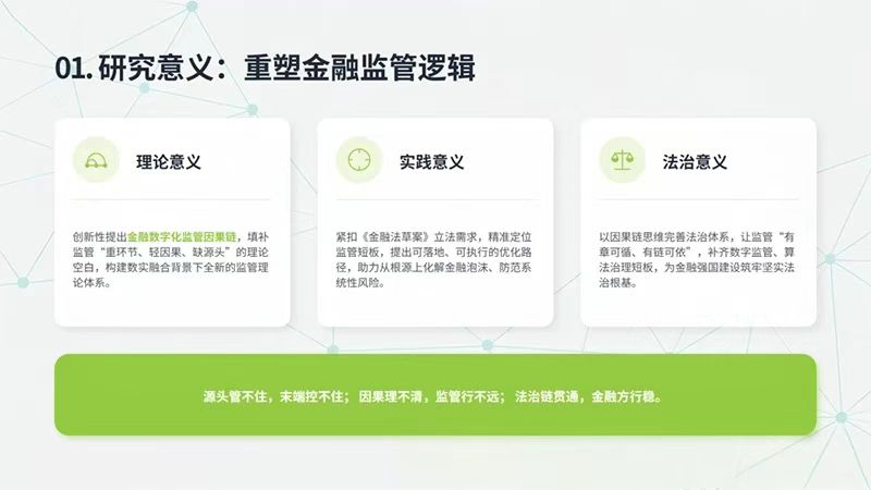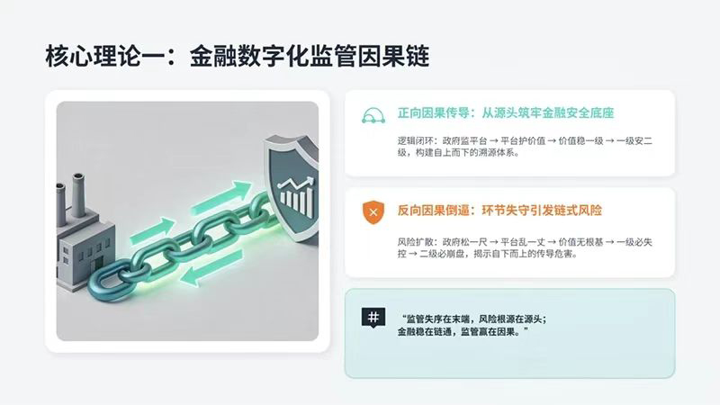 1.金融监管因果链理论:强调风险源于源头,监管需遵循 “政府监平台→平台护价值→价值稳一级→一级安二级” 的正向传导逻辑,实现从源头治理到末端风控的全链条闭环。