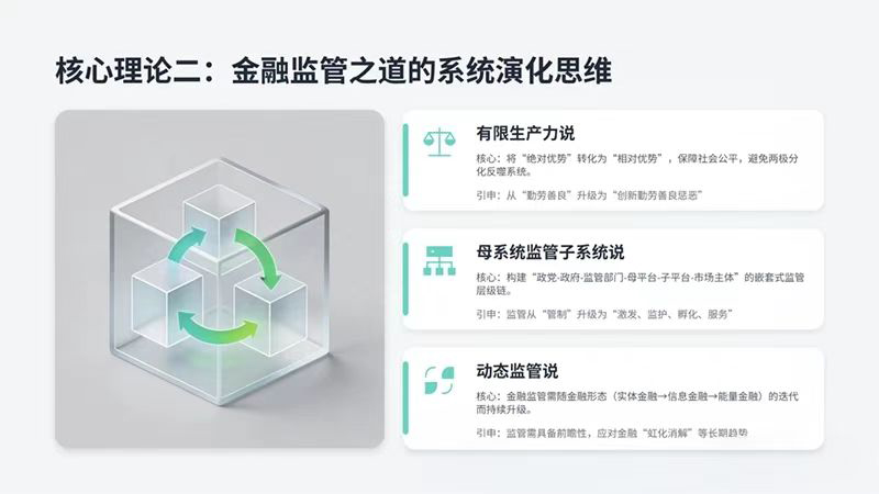 2.系统演化思维:主张金融监管应具备系统观、演化观,构建 “母系统监管子系统” 的嵌套式层级体系,并随金融形态的演进而动态调整。