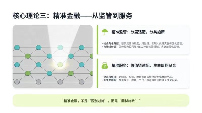 3.精准金融理论:倡导监管与服务的 “精准化”,通过对社会角色、市场领域、产业链环节、消费者生命周期的分层分类,实现 “因材施教” 式的监管与服务。