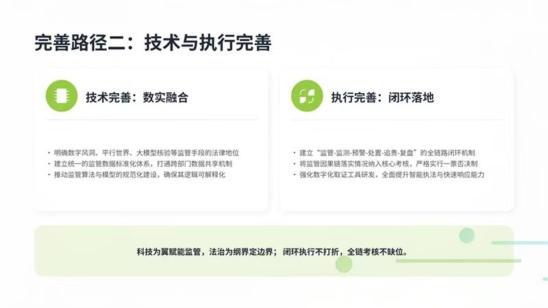 在草案第 8 条监管原则中增加一款:“金融监管应当充分利用数据要素,保障监管数据的真实、准确、完整与安全共享。监管机构及被监管对象使用算法进行决策的,应当遵循算法合规、模型可解释、技术中立的原则。” 这将为后续章节的数智化监管提供总则性依据。
