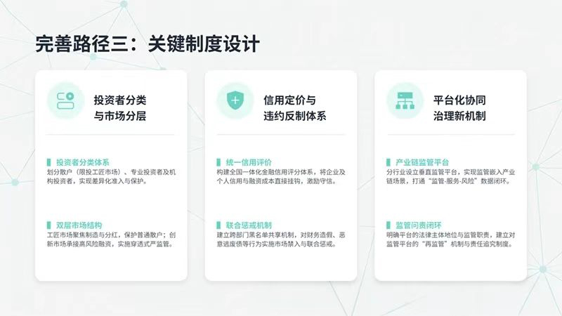 在草案第 40 条投资者适当性管理基础上,进一步细化,明确将投资者分为散户、专业投资者和机构投资者。同时,在第五章金融市场中,建议增加关于金融市场横向分类的规定,设立以现金分红为核心、面向散户的 “工匠股票市场”,以及面向专业投资者的“创新股票市场” 和 “人力资本股票市场”,实现风险与能力的精准匹配。