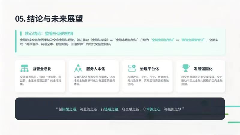 我们深信,《金融法》的制定是一项关乎国家金融安全与长远发展的重大工程。将全息金融监管的理念融入其中,不仅是对现有金融监管体系的完善,更是对未来数智化金融生态的主动适应和前瞻性布局。